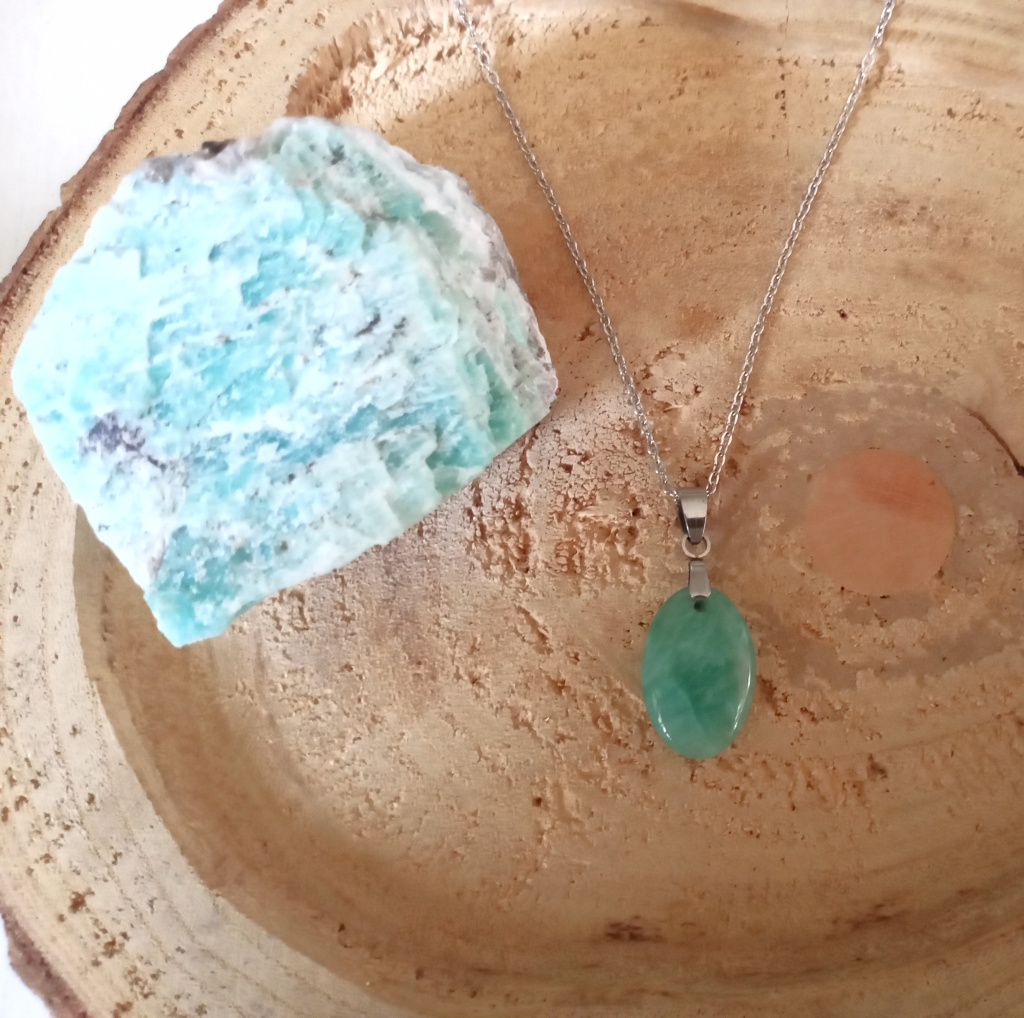 Náhrdelník je tvořen řetízkem z chirurgické oceli, přívěšek z leštěného Amazonitu, délka řetízku je 50 cm, velikost kamínku je 20 mm x 13 mm x 6 mm.